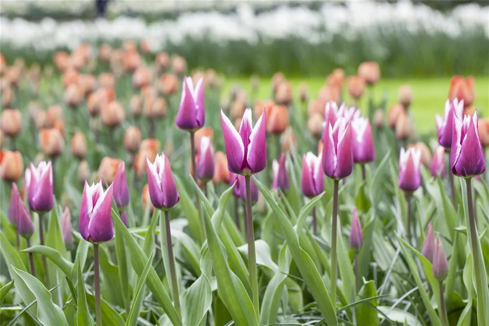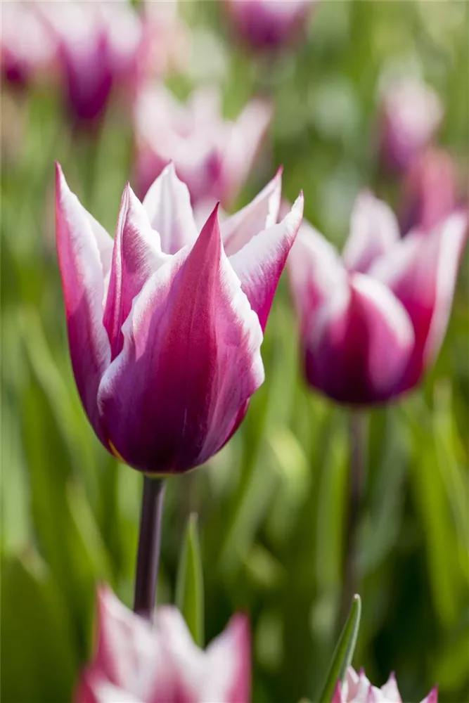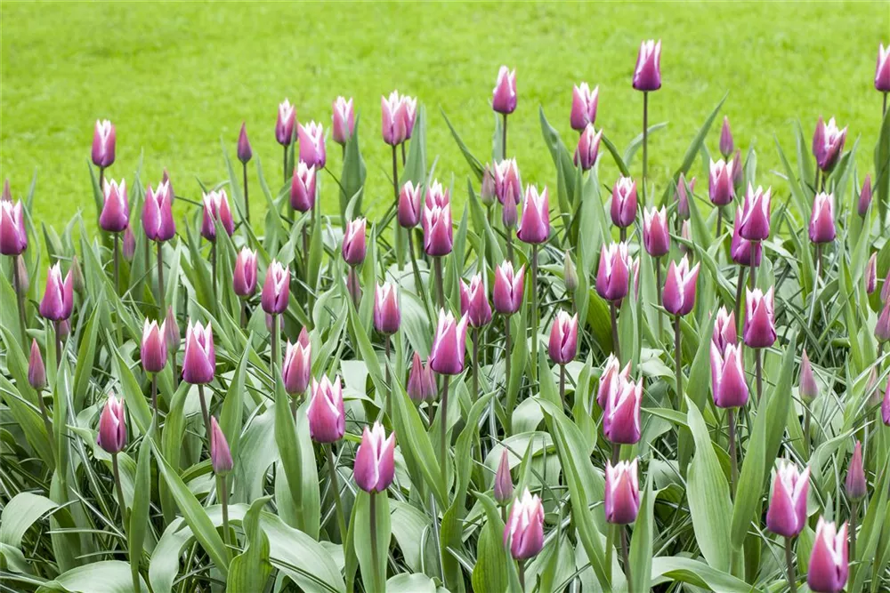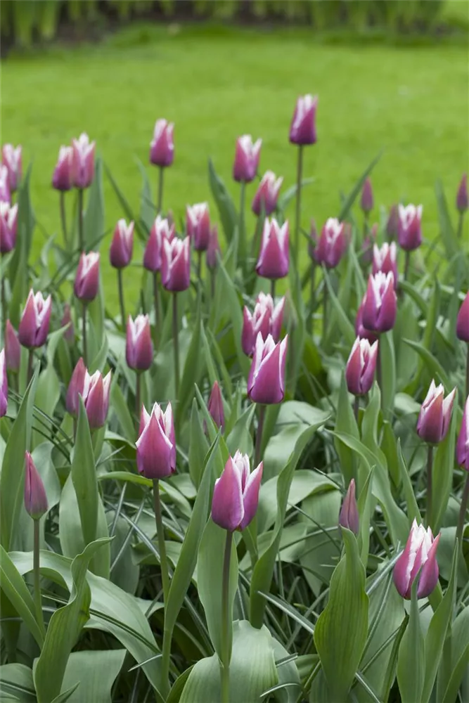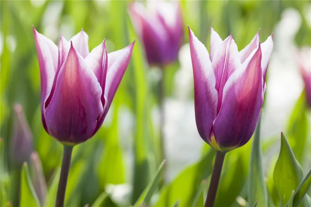 Ab April lässt die Lilienblütige Tulpe 'Claudia' ihre Blüten in Violett-weiß erstrahlen und ihren angenehmen Duft verbreiten.