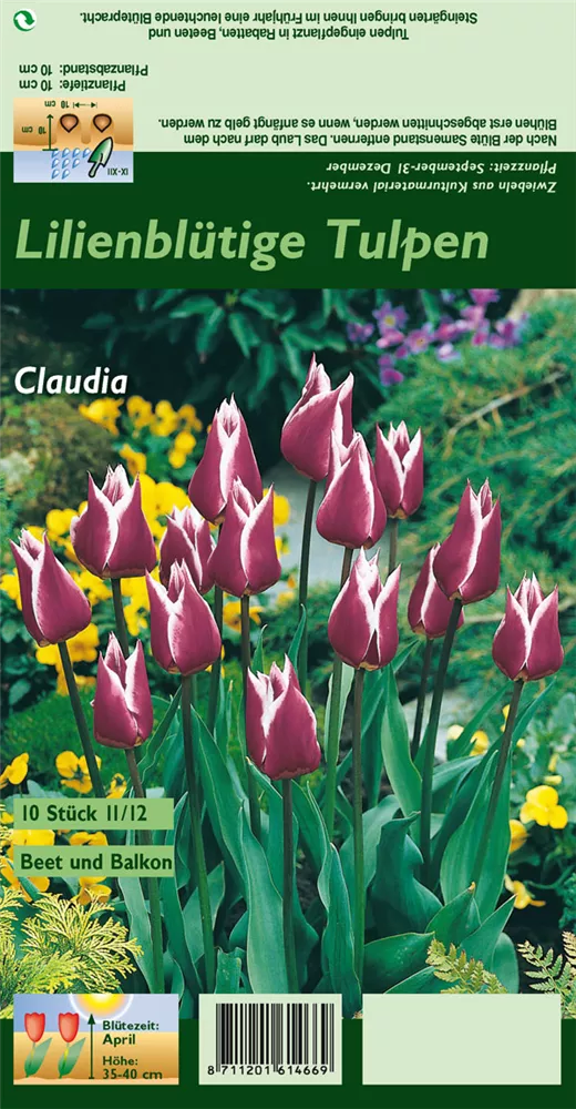 Welch eine Pracht, wenn die Lilienblütige Tulpe 'Claudia' ab April ihre herrlichen, violett-weißen Blüten hervorbringt! Das Besondere: sie verbreiten einen angenehmen Duft. Über den dunkelgrünen, linealen Blättern kommen die Blüten besonders gut zur Geltung. Wird Tulipa 'Claudia' an einen sonnigen Standort mit durchlässigem, lockerem und nährstoffreichem Boden gepflanzt, entwickelt sie sich besonders gut. Sie wächst aufrecht, schlank und erreicht Größen von 35 cm bis 40 cm bei einer Breite von 8 cm bis 10 cm. Sehr dekorativ macht sich die Lilienblütige Tulpe 'Claudia' auch in Kübeln oder Kästen.