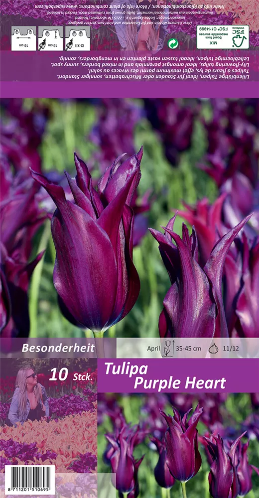 Welch eine Pracht, wenn die Lilienblütige Tulpe 'Purple Heart' ab April ihre herrlichen, purpurroten Blüten hervorbringt! Das Besondere: sie verbreiten einen angenehmen Duft. Über den dunkelgrünen, linealen Blättern kommen die Blüten besonders gut zur Geltung. Wird Tulipa 'Purple Heart' an einen sonnigen Standort mit durchlässigem, lockerem und nährstoffreichem Boden gepflanzt, entwickelt sie sich besonders gut. Sie wächst schlank, aufrecht und erreicht Größen von 35 cm bis 45 cm bei einer Breite von 8 cm bis 10 cm. Sehr dekorativ macht sich die Lilienblütige Tulpe 'Purple Heart' auch in Kübeln oder Kästen.