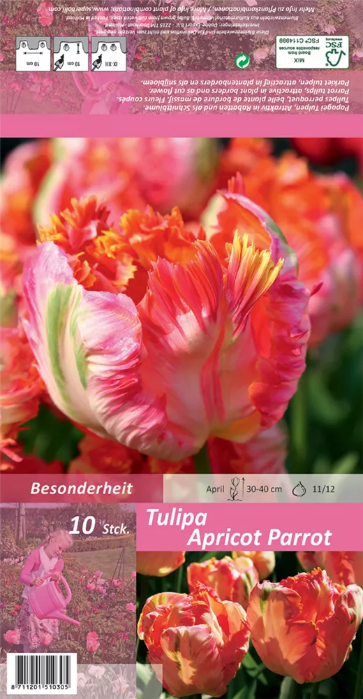 Welch eine Pracht, wenn die Papageien-Tulpe 'Apricot Parrot' ab April ihre herrlichen, mehrfarbigen, gewellten Blüten hervorbringt! Das Besondere: sie verbreiten einen angenehmen Duft. Über den dunkelgrünen, linealen Blättern kommen die Blüten besonders gut zur Geltung. Wird Tulipa 'Apricot Parrot' an einen sonnigen Standort mit durchlässigem, lockerem und nährstoffreichem Boden gepflanzt, entwickelt sie sich besonders gut. Sie wächst aufrecht, schlank und erreicht Größen von 30 cm bis 40 cm bei einer Breite von 10 cm bis 12 cm. Sehr dekorativ macht sich die Papageien-Tulpe 'Apricot Parrot' auch in Kübeln oder Kästen.