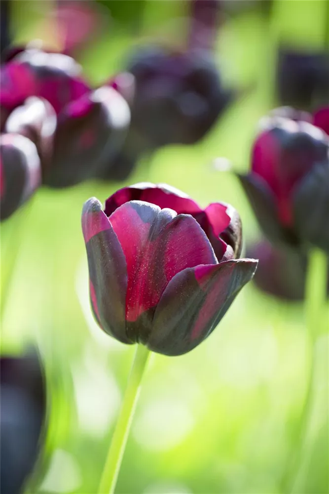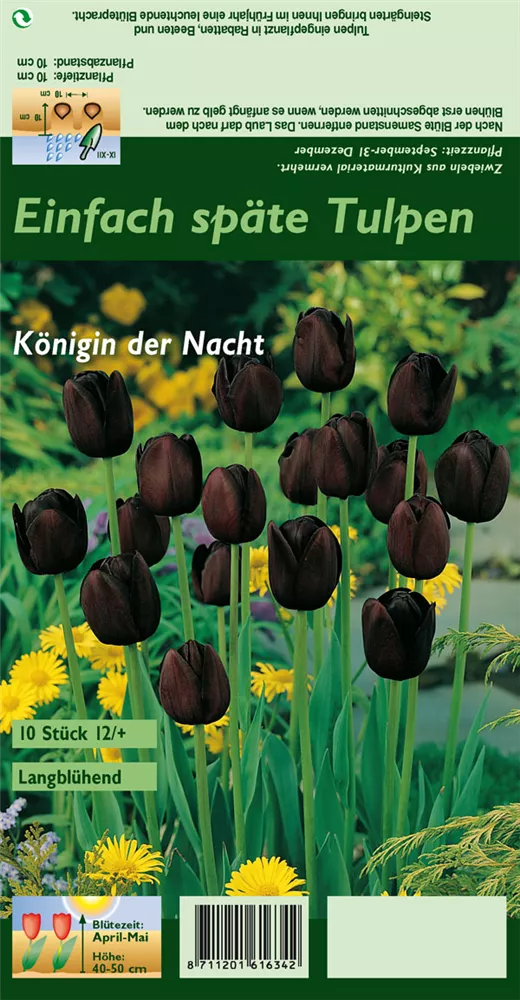Welch eine Pracht, wenn die Schwarze Tulpe 'Queen of Night' ab April ihre herrlichen, purpurvioletten Blüten hervorbringt! Das Besondere: sie verbreiten einen angenehmen Duft. Über den dunkelgrünen, linealen Blättern kommen die Blüten besonders gut zur Geltung. Wird Tulipa 'Queen of Night' an einen sonnigen Standort mit durchlässigem, lockerem und nährstoffreichem Boden gepflanzt, entwickelt sie sich besonders gut. Sie wächst schlank und erreicht Größen von 40 cm bis 50 cm bei einer Breite von 10 cm bis 12 cm. Sehr dekorativ macht sich die Schwarze Tulpe 'Queen of Night' auch in Kübeln oder Kästen.