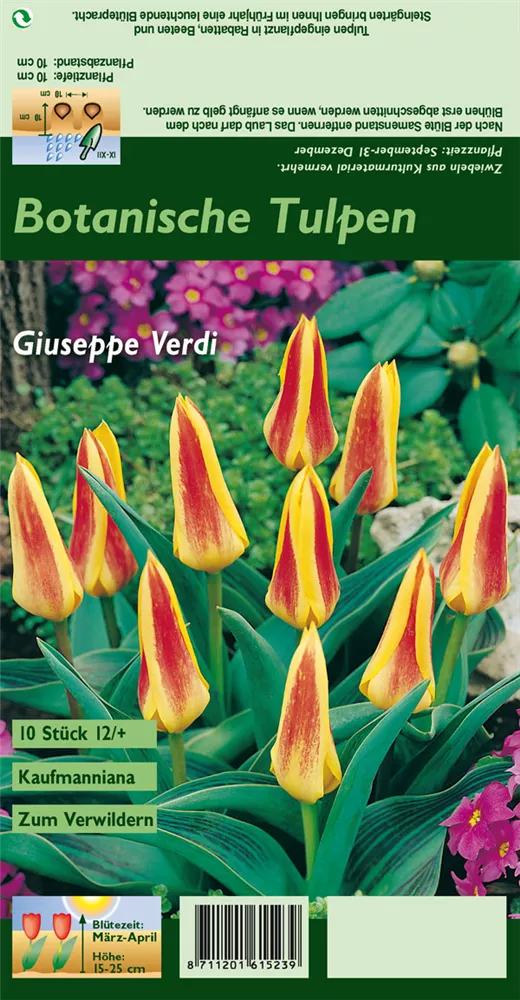 Welch eine Pracht, wenn die Seerosen-Tulpe 'Giuseppe Verdi' ab März ihre herrlichen, gelb-roten Blüten hervorbringt! Das Besondere: sie verbreiten einen angenehmen Duft. Über den dunkelgrünen, linealen Blättern kommen die Blüten besonders gut zur Geltung. Wird Tulipa kaufmanniana 'Giuseppe Verdi' an einen sonnigen Standort mit durchlässigem und lockerem Boden gepflanzt, entwickelt sie sich besonders gut. Sie wächst aufrecht, schlank und erreicht Größen von 15 cm bis 25 cm bei einer Breite von 8 cm bis 10 cm. Sehr dekorativ macht sich die Seerosen-Tulpe 'Giuseppe Verdi' auch in Kübeln oder Kästen.