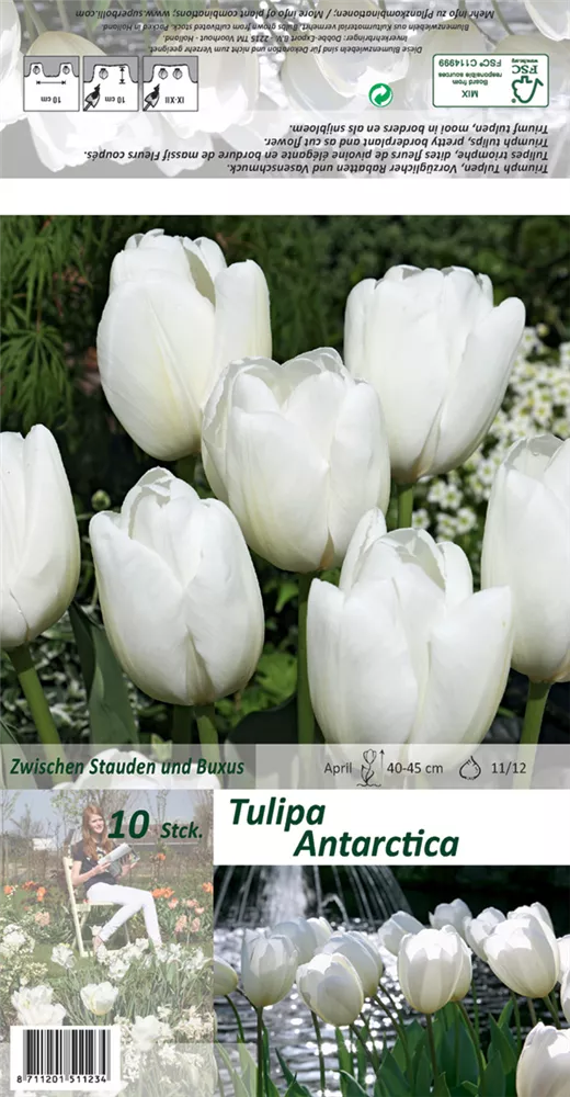 Welch eine Pracht, wenn die Triumph-Tulpe 'Antarctica' ab April ihre herrlichen, weißen Blüten hervorbringt! Das Besondere: sie verbreiten einen angenehmen Duft. Über den dunkelgrünen, linealen Blättern kommen die Blüten besonders gut zur Geltung. Wird Tulipa 'Antarctica' an einen sonnigen Standort mit durchlässigem und humosem Boden gepflanzt, entwickelt sie sich besonders gut. Sie wächst schlank, aufrecht und erreicht Größen von 40 cm bis 45 cm bei einer Breite von 8 cm bis 10 cm. Sehr dekorativ macht sich die Triumph-Tulpe 'Antarctica' auch in Kübeln oder Kästen. Tulipa 'Antarctica' hat sich als besonders pflegeleicht erwiesen.