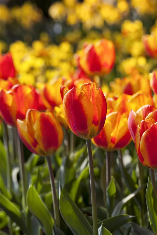 Zusammengepflanzt mit Narzisse bildet die Tulpe 'Apeldoorn Elite' einen harmonischen Anblick.