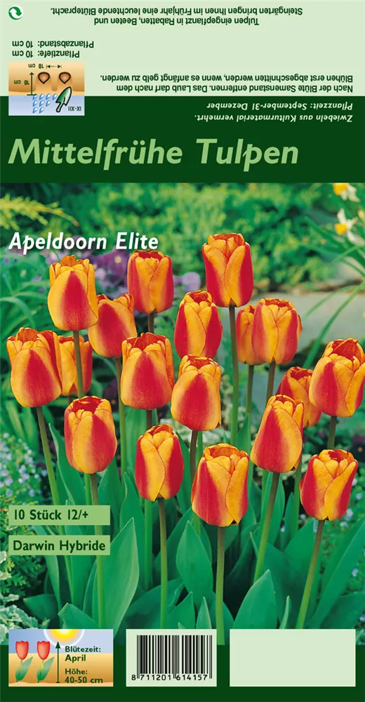 Welch eine Pracht, wenn die Tulpe 'Apeldoorn Elite' ab April ihre herrlichen, gelb-roten Blüten hervorbringt! Das Besondere: sie verbreiten einen angenehmen Duft. Über den dunkelgrünen, linealen Blättern kommen die Blüten besonders gut zur Geltung. Wird Tulipa 'Apeldoorn Elite' an einen sonnigen Standort mit durchlässigem, lockerem und nährstoffreichem Boden gepflanzt, entwickelt sie sich besonders gut. Sie wächst aufrecht, schlank und erreicht Größen von 40 cm bis 50 cm bei einer Breite von 10 cm bis 12 cm. Sehr dekorativ macht sich die Tulpe 'Apeldoorn Elite' auch in Kübeln oder Kästen.