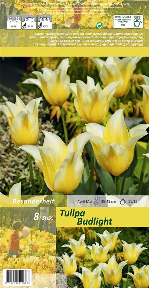 Welch eine Pracht, wenn die Tulpe 'Budlight' ab April ihre herrlichen, gelb-weißen Blüten hervorbringt! Das Besondere: sie verbreiten einen angenehmen Duft. Über den dunkelgrünen, linealen Blättern kommen die Blüten besonders gut zur Geltung. Wird Tulipa 'Budlight' an einen sonnigen Standort mit durchlässigem, lockerem und nährstoffreichem Boden gepflanzt, entwickelt sie sich besonders gut. Sie wächst schlank, aufrecht und erreicht Größen von 35 cm bis 45 cm bei einer Breite von 8 cm bis 10 cm. Sehr dekorativ macht sich die Tulpe 'Budlight' auch in Kübeln oder Kästen.