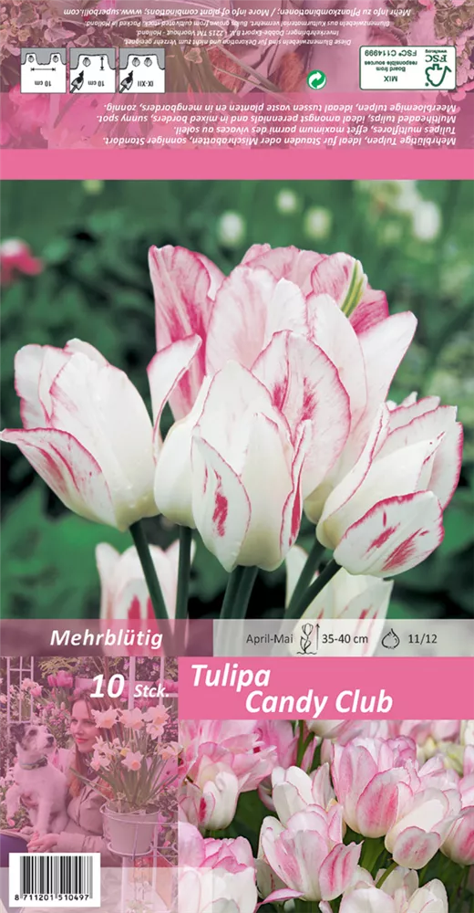 Welch eine Pracht, wenn die Tulpe 'Candy Club' ab April ihre herrlichen, cremeweiß-rosafarbenen Blüten hervorbringt! Das Besondere: sie verbreiten einen angenehmen Duft. Über den dunkelgrünen, linealen Blättern kommen die Blüten besonders gut zur Geltung. Wird Tulipa 'Candy Club' an einen sonnigen Standort mit durchlässigem, lockerem und nährstoffreichem Boden gepflanzt, entwickelt sie sich besonders gut. Sie wächst schlank und erreicht Größen von 35 cm bis 40 cm bei einer Breite von 15 cm bis 20 cm. Sehr dekorativ macht sich die Tulpe 'Candy Club' auch in Kübeln oder Kästen.