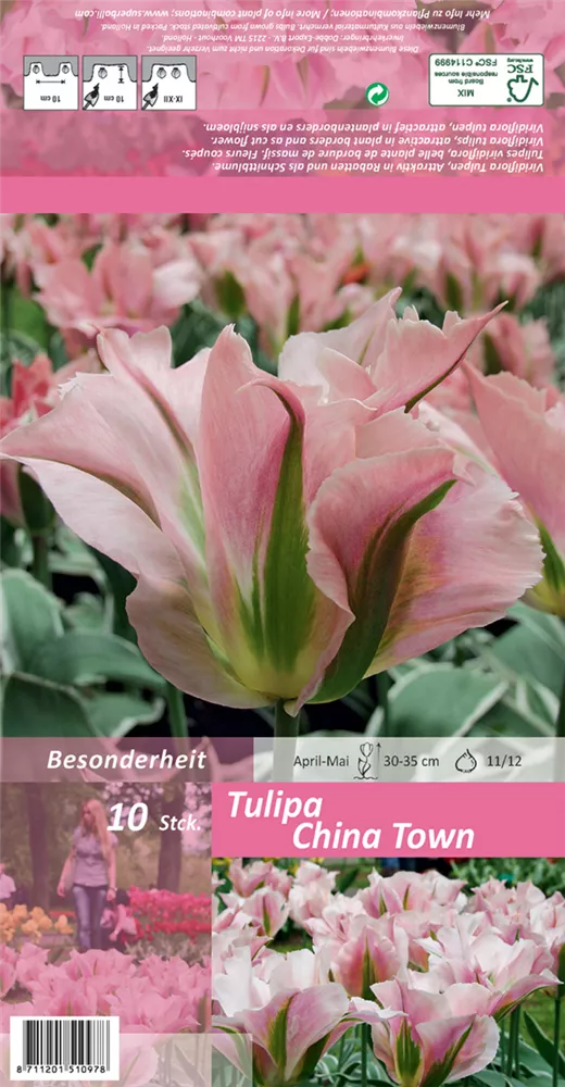 Welch eine Pracht, wenn die Tulpe 'China Town' ab April ihre herrlichen, rosa-grünen Blüten hervorbringt! Über den dunkelgrünen, linealen Blättern kommen die Blüten besonders gut zur Geltung. Wird Tulipa viridiflora 'China Town' an einen sonnigen bis halbschattigen Standort mit durchlässigem, lockerem und nährstoffreichem Boden gepflanzt, entwickelt sie sich besonders gut. Sie wächst aufrecht, schlank und erreicht Größen von 30 cm bis 35 cm bei einer Breite von 8 cm bis 10 cm. Sehr dekorativ macht sich die Tulpe 'China Town' auch in Kübeln oder Kästen.