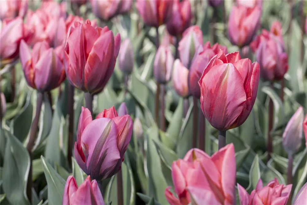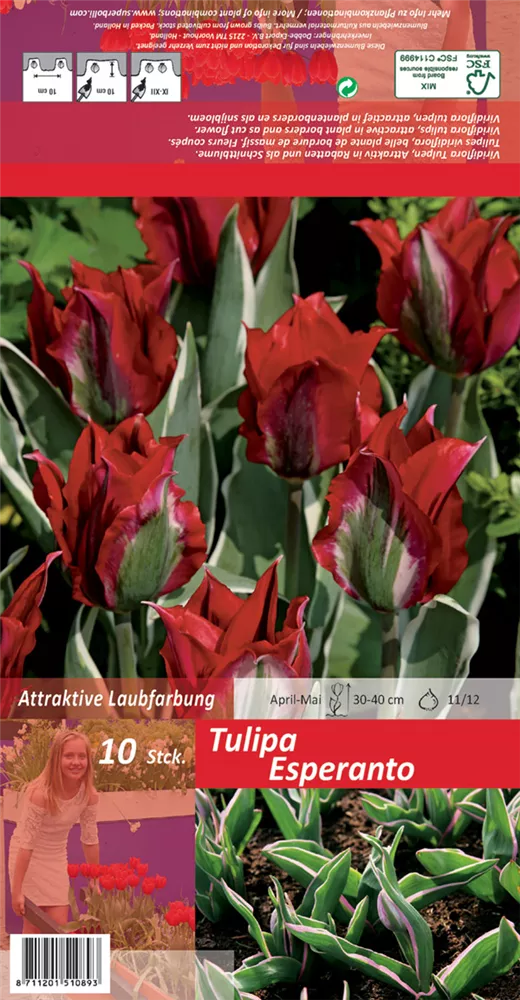 Welch eine Pracht, wenn die Tulpe 'Esperanto' ab Mai ihre herrlichen, grün-roten Blüten hervorbringt! Über den dunkelgrünen, linealen Blättern kommen die Blüten besonders gut zur Geltung. Wird Tulipa viridiflora 'Esperanto' an einen sonnigen bis halbschattigen Standort mit durchlässigem, lockerem und nährstoffreichem Boden gepflanzt, entwickelt sie sich besonders gut. Sie wächst aufrecht, schlank und erreicht Größen von 30 cm bis 40 cm bei einer Breite von 8 cm bis 10 cm. Sehr dekorativ macht sich die Tulpe 'Esperanto' auch in Kübeln oder Kästen.