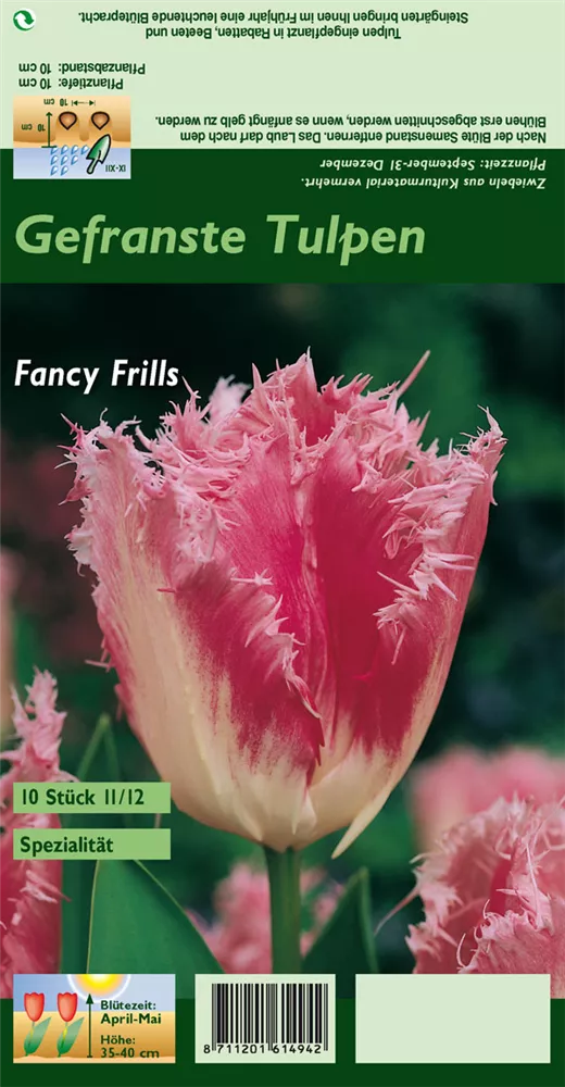 Welch eine Pracht, wenn die Tulpe 'Fancy Frills' ab April ihre herrlichen, rosafarbenen, gefransten Blüten hervorbringt! Das Besondere: sie verbreiten einen angenehmen Duft. Über den dunkelgrünen, linealen Blättern kommen die Blüten besonders gut zur Geltung. Wird Tulipa 'Fancy Frills' an einen sonnigen bis halbschattigen Standort mit durchlässigem, lockerem und nährstoffreichem Boden gepflanzt, entwickelt sie sich besonders gut. Sie wächst aufrecht, schlank und erreicht Größen von 30 cm bis 40 cm bei einer Breite von 8 cm bis 10 cm. Sehr dekorativ macht sich die Tulpe 'Fancy Frills' auch in Kübeln oder Kästen.