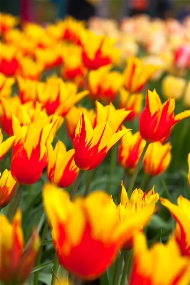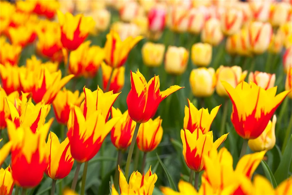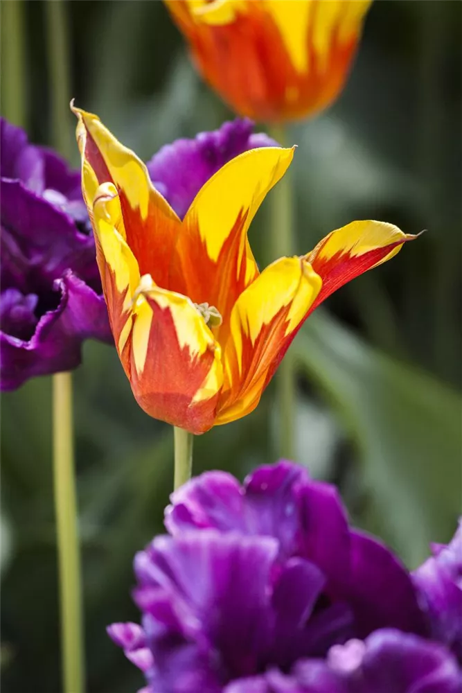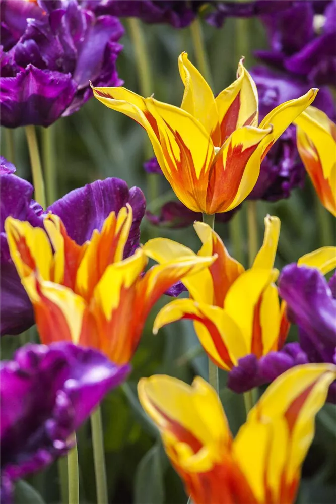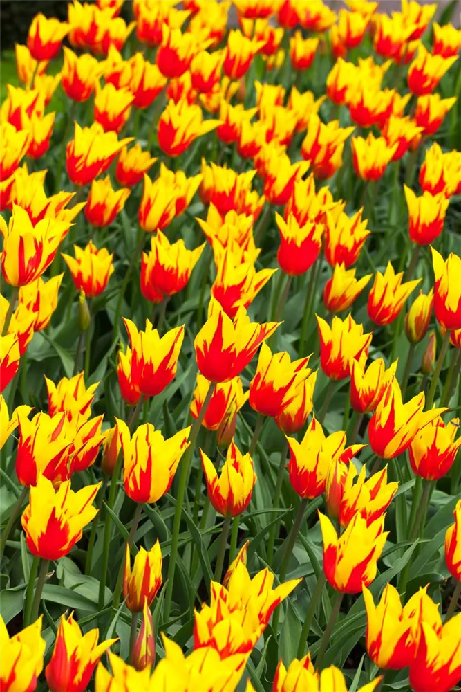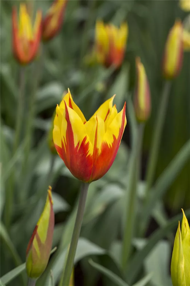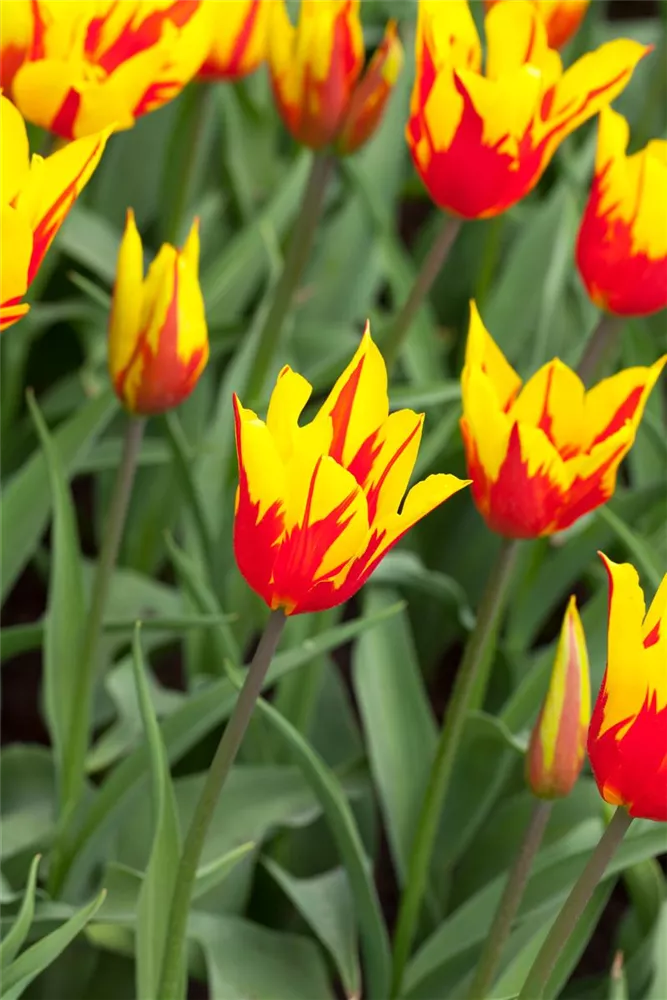 Zwischen April und Mai lässt die Tulpe 'Fire Wings' ihre Blüten in Gelb-rot erstrahlen und ihren angenehmen Duft verbreiten.
