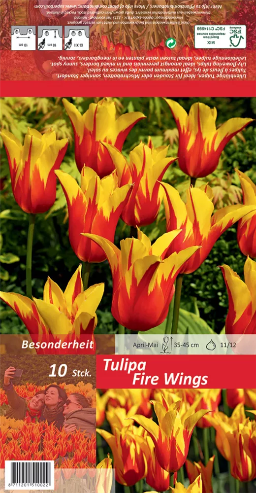 Welch eine Pracht, wenn die Tulpe 'Fire Wings' ab April ihre herrlichen, gelb-roten Blüten hervorbringt! Das Besondere: sie verbreiten einen angenehmen Duft. Über den dunkelgrünen, linealen Blättern kommen die Blüten besonders gut zur Geltung. Wird Tulipa 'Fire Wings' an einen sonnigen Standort mit durchlässigem, lockerem und nährstoffreichem Boden gepflanzt, entwickelt sie sich besonders gut. Sie wächst schlank, aufrecht und erreicht Größen von 35 cm bis 45 cm bei einer Breite von 8 cm bis 10 cm. Sehr dekorativ macht sich die Tulpe 'Fire Wings' auch in Kübeln oder Kästen.