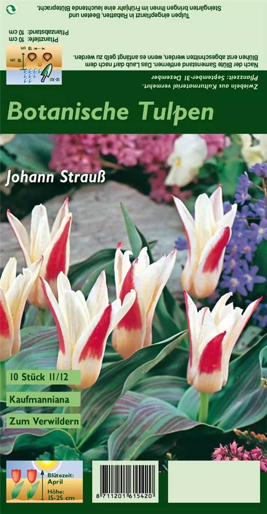 Welch eine Pracht, wenn die Tulpe 'Johann Strauss' ab April ihre herrlichen, weiß-roten Blüten hervorbringt! Das Besondere: sie verbreiten einen angenehmen Duft. Über den dunkelgrünen, linealen Blättern kommen die Blüten besonders gut zur Geltung. Wird Tulipa kaufmanniana 'Johann Strauss' an einen sonnigen Standort mit durchlässigem und lockerem Boden gepflanzt, entwickelt sie sich besonders gut. Sie wächst aufrecht, schlank und erreicht Größen von 15 cm bis 25 cm bei einer Breite von 8 cm bis 10 cm. Sehr dekorativ macht sich die Tulpe 'Johann Strauss' auch in Kübeln oder Kästen.