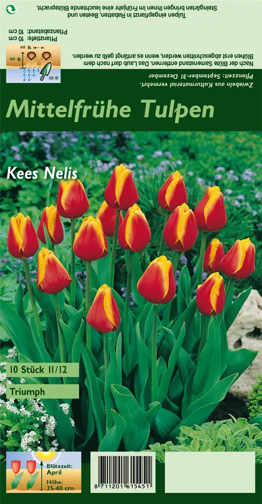 Welch eine Pracht, wenn die Tulpe 'Kees Nelis' ab April ihre herrlichen, gelb-roten Blüten hervorbringt! Das Besondere: sie verbreiten einen angenehmen Duft. Über den dunkelgrünen, linealen Blättern kommen die Blüten besonders gut zur Geltung. Wird Tulipa 'Kees Nelis' an einen sonnigen Standort mit durchlässigem und humosem Boden gepflanzt, entwickelt sie sich besonders gut. Sie wächst schlank, aufrecht und erreicht Größen von 30 cm bis 40 cm bei einer Breite von 10 cm bis 15 cm. Sehr dekorativ macht sich die Tulpe 'Kees Nelis' auch in Kübeln oder Kästen. Tulipa 'Kees Nelis' hat sich als besonders pflegeleicht erwiesen.