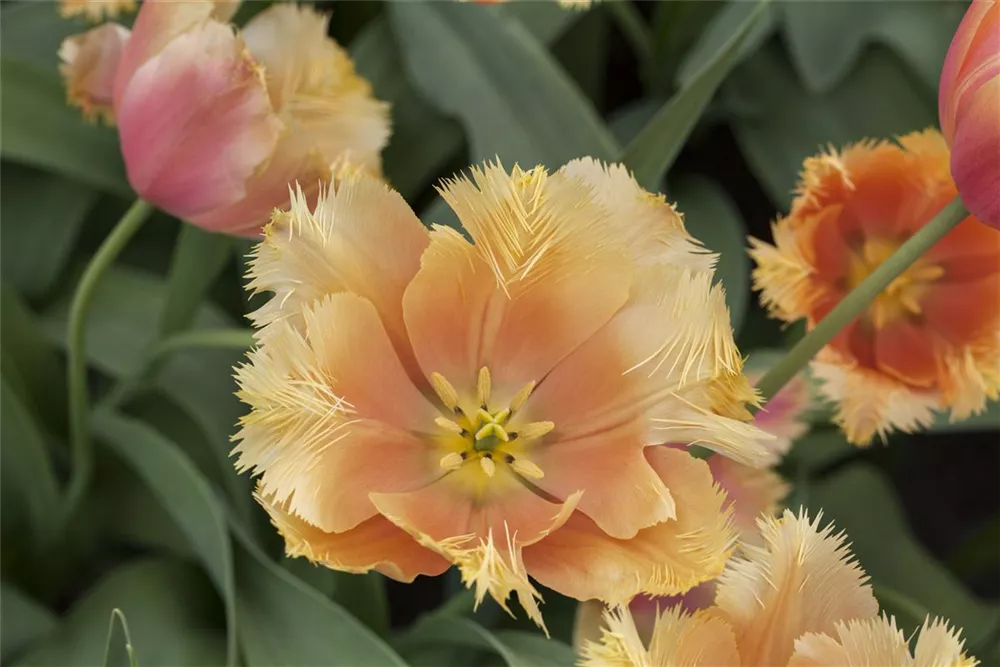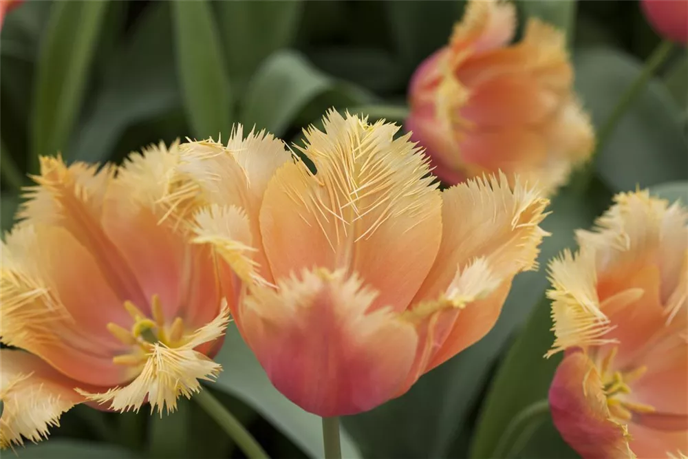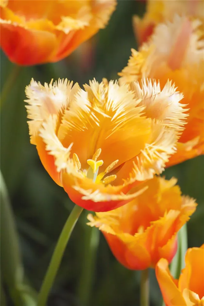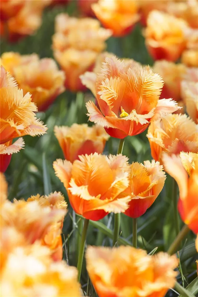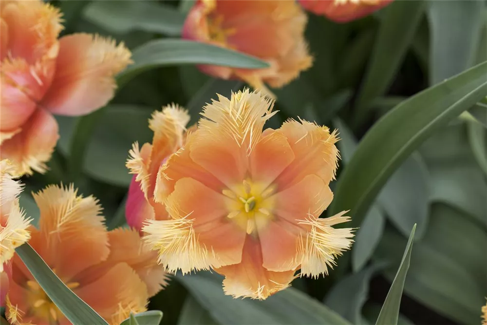 Ab Mai lässt die Tulpe 'Lambada' ihre Blüten in Orange-gelb erstrahlen und ihren angenehmen Duft verbreiten. Die Blüten sind gefranst.