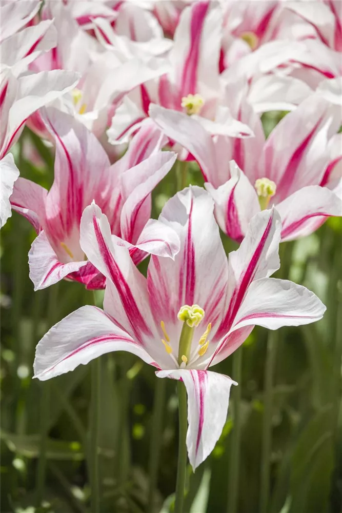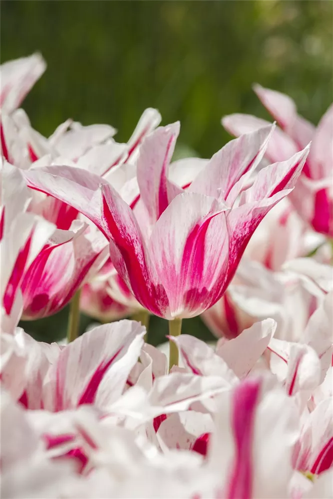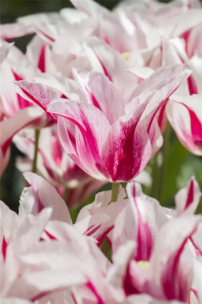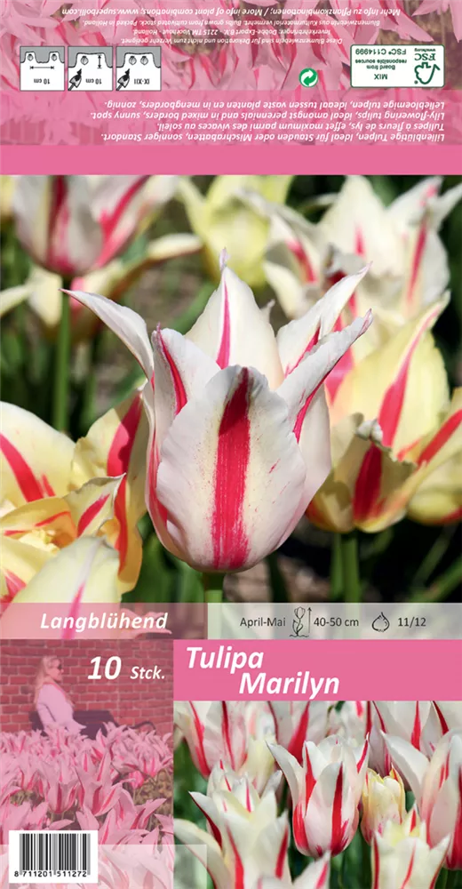 Welch eine Pracht, wenn die Tulpe 'Marilyn' ab April ihre herrlichen, purpurrot-weißen Blüten hervorbringt! Das Besondere: sie verbreiten einen angenehmen Duft. Über den dunkelgrünen, linealen Blättern kommen die Blüten besonders gut zur Geltung. Wird Tulipa 'Marilyn' an einen sonnigen Standort mit durchlässigem, lockerem und nährstoffreichem Boden gepflanzt, entwickelt sie sich besonders gut. Sie wächst schlank, aufrecht und erreicht Größen von 40 cm bis 50 cm bei einer Breite von 8 cm bis 10 cm. Sehr dekorativ macht sich die Tulpe 'Marilyn' auch in Kübeln oder Kästen.