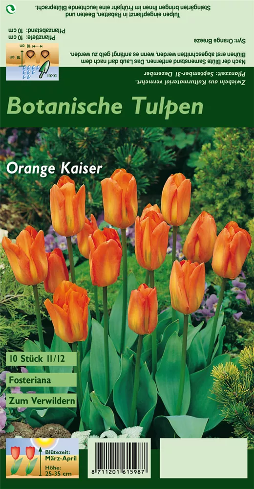 Welch eine Pracht, wenn die Tulpe 'Oranger Kaiser' ab März ihre herrlichen, orangefarbenen Blüten hervorbringt! Das Besondere: sie verbreiten einen angenehmen Duft. Über den dunkelgrünen, linealen Blättern kommen die Blüten besonders gut zur Geltung. Wird Tulipa fosteriana 'Oranger Kaiser' an einen sonnigen Standort mit durchlässigem, lockerem und nährstoffreichem Boden gepflanzt, entwickelt sie sich besonders gut. Sie wächst aufrecht, schlank und erreicht Größen von 25 cm bis 35 cm bei einer Breite von 10 cm bis 12 cm. Sehr dekorativ macht sich die Tulpe 'Oranger Kaiser' auch in Kübeln oder Kästen.