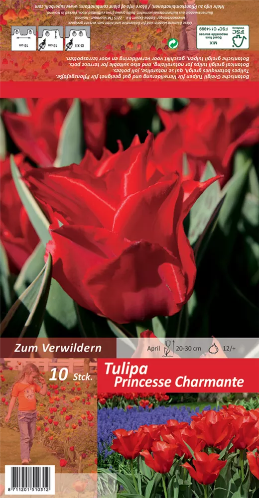 Welch eine Pracht, wenn die Tulpe 'Princesse Charmante' ab April ihre herrlichen, roten Blüten hervorbringt! Das Besondere: sie verbreiten einen angenehmen Duft. Über den dunkelgrünen, linealen Blättern kommen die Blüten besonders gut zur Geltung. Wird Tulipa greigii 'Princesse Charmante' an einen sonnigen Standort mit durchlässigem, lockerem und nährstoffreichem Boden gepflanzt, entwickelt sie sich besonders gut. Sie wächst schlank, aufrecht und erreicht Größen von 20 cm bis 30 cm bei einer Breite von 8 cm bis 10 cm. Sehr dekorativ macht sich die Tulpe 'Princesse Charmante' auch in Kübeln oder Kästen.