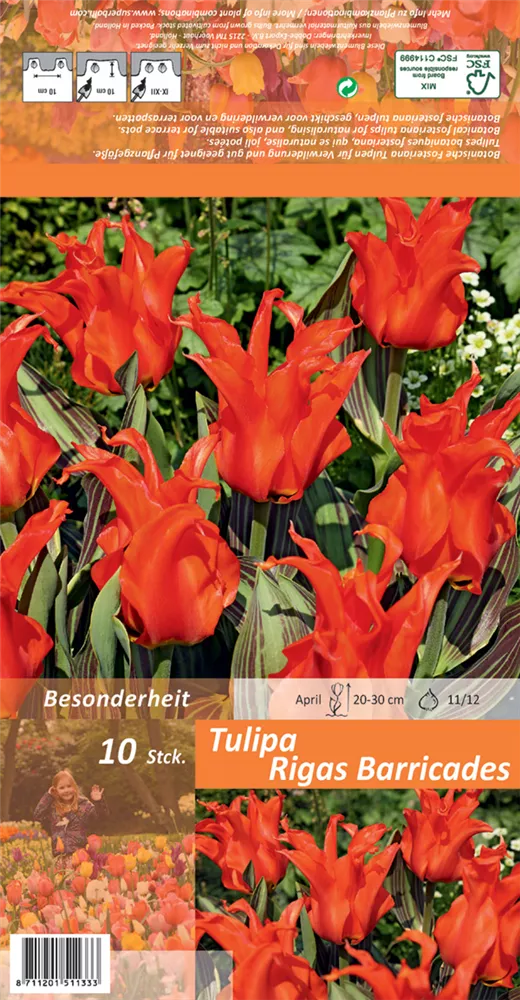 Welch eine Pracht, wenn die Tulpe 'Rigas Barricades' ab April ihre herrlichen, orangefarbenen Blüten hervorbringt! Das Besondere: sie verbreiten einen angenehmen Duft. Über den dunkelgrünen, linealen Blättern kommen die Blüten besonders gut zur Geltung. Wird Tulipa fosteriana 'Rigas Barricades' an einen sonnigen Standort mit durchlässigem, lockerem und nährstoffreichem Boden gepflanzt, entwickelt sie sich besonders gut. Sie wächst aufrecht, schlank und erreicht Größen von 20 cm bis 30 cm bei einer Breite von 10 cm bis 12 cm. Sehr dekorativ macht sich die Tulpe 'Rigas Barricades' auch in Kübeln oder Kästen.