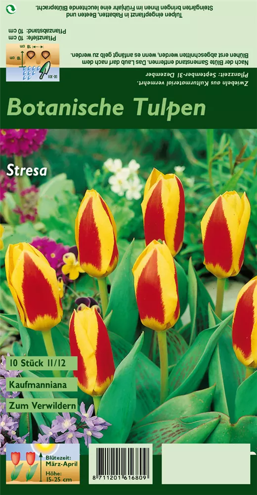Welch eine Pracht, wenn die Tulpe 'Stresa' ab März ihre herrlichen, gelb-roten Blüten hervorbringt! Das Besondere: sie verbreiten einen angenehmen Duft. Über den dunkelgrünen, linealen Blättern kommen die Blüten besonders gut zur Geltung. Wird Tulipa kaufmanniana 'Stresa' an einen sonnigen Standort mit durchlässigem und lockerem Boden gepflanzt, entwickelt sie sich besonders gut. Sie wächst aufrecht, schlank und erreicht Größen von 15 cm bis 25 cm bei einer Breite von 8 cm bis 10 cm. Sehr dekorativ macht sich die Tulpe 'Stresa' auch in Kübeln oder Kästen.