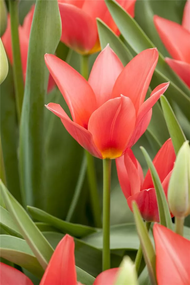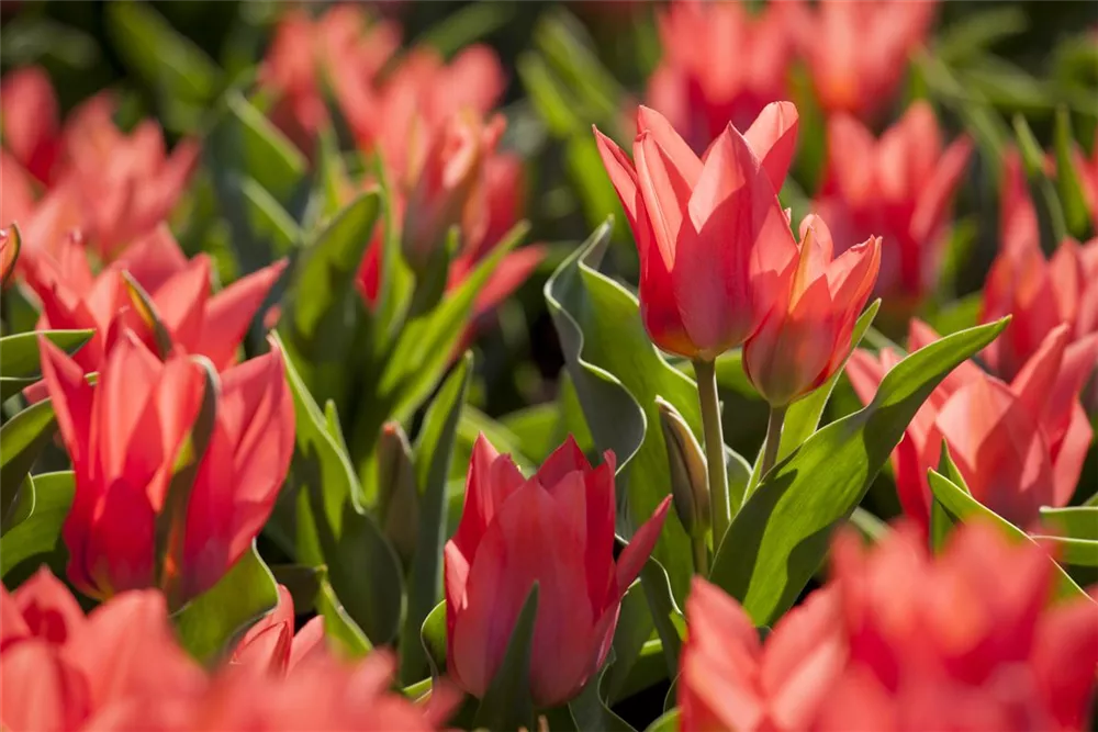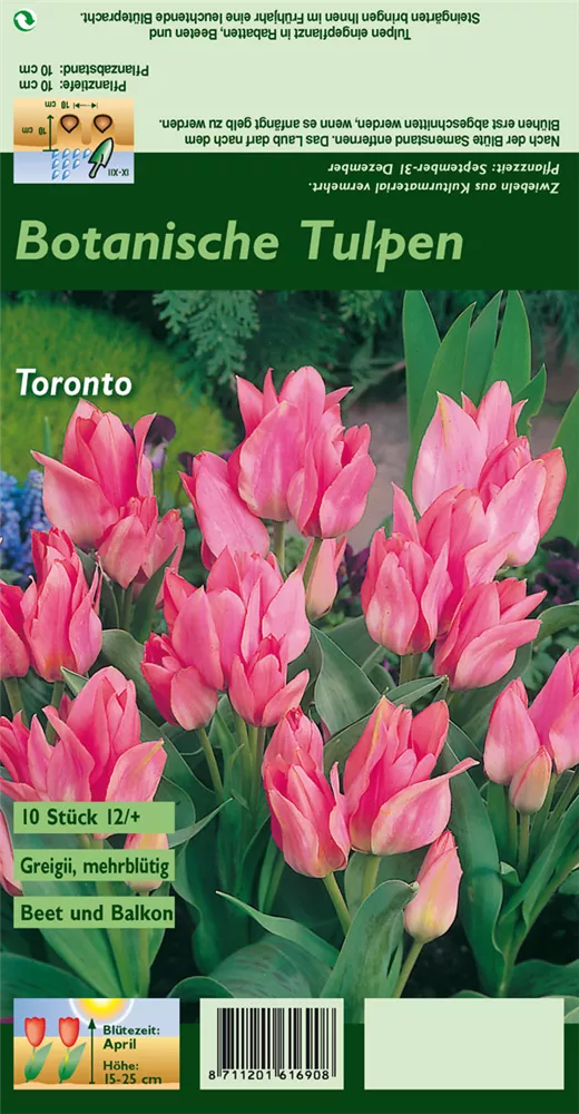 Welch eine Pracht, wenn die Tulpe 'Toronto' ab März ihre herrlichen, rosafarbenen Blüten hervorbringt! Über den dunkelgrünen, linealen Blättern kommen die Blüten besonders gut zur Geltung. Wird Tulipa greigii 'Toronto' an einen sonnigen Standort mit durchlässigem, lockerem und nährstoffreichem Boden gepflanzt, entwickelt sie sich besonders gut. Sie wächst aufrecht, schlank und erreicht Größen von 15 cm bis 25 cm bei einer Breite von 8 cm bis 10 cm. Sehr dekorativ macht sich die Tulpe 'Toronto' auch in Kübeln oder Kästen.