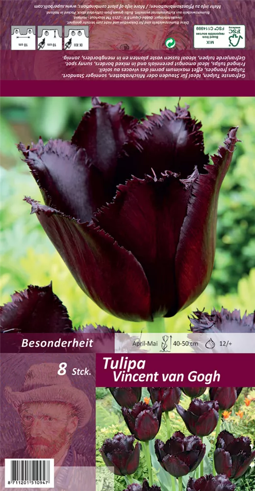 Welch eine Pracht, wenn die Tulpe 'Vincent van Gogh' ab April ihre herrlichen, schwarz-roten Blüten hervorbringt! Das Besondere: sie verbreiten einen angenehmen Duft. Über den dunkelgrünen, linealen Blättern kommen die Blüten besonders gut zur Geltung. Wird Tulipa 'Vincent van Gogh' an einen sonnigen Standort mit durchlässigem, lockerem und nährstoffreichem Boden gepflanzt, entwickelt sie sich besonders gut. Sie wächst schlank und erreicht Größen von 40 cm bis 50 cm bei einer Breite von 15 cm bis 20 cm. Sehr dekorativ macht sich die Tulpe 'Vincent van Gogh' auch in Kübeln oder Kästen.