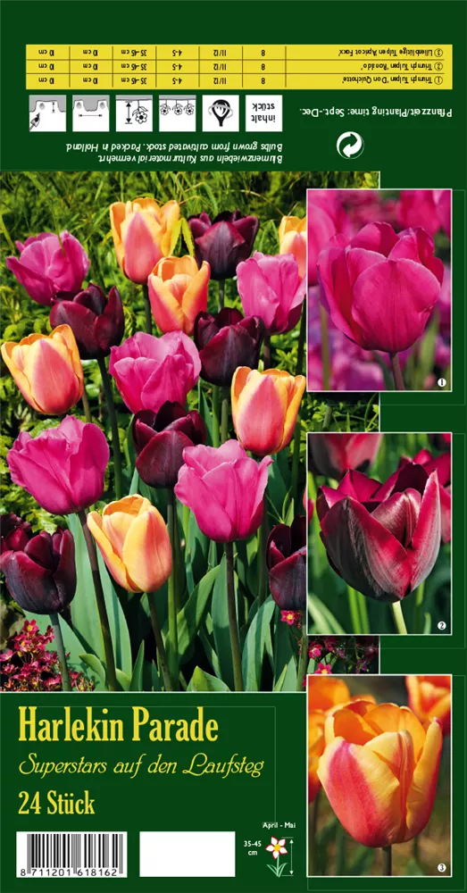 Welch eine Pracht, wenn der Tulpen-Mix 'Harlekin Parade' ab April seine herrlichen, purpurroten, magentafarbenen bis rot-gelben Blüten hervorbringt! Das Besondere: sie verbreiten einen angenehmen Duft. Über den dunkelgrünen, linealen Blättern kommen die Blüten besonders gut zur Geltung. Wird Tulipa 'Harlekin Parade' an einen sonnigen Standort mit durchlässigem, lockerem und nährstoffreichem Boden gepflanzt, entwickelt er sich besonders gut. Er wächst schlank und erreicht Größen von 35 cm bis 45 cm bei einer Breite von 15 cm bis 20 cm. Sehr dekorativ macht sich der Tulpen-Mix 'Harlekin Parade' auch in Kübeln oder Kästen.