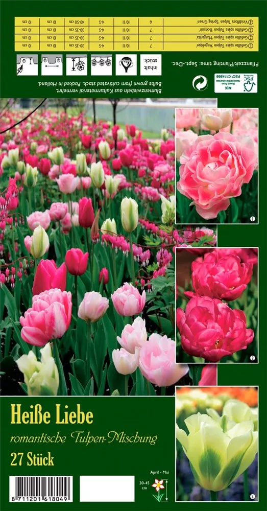 Welch eine Pracht, wenn die Tulpen-Mix 'Heiße Liebe' ab April ihre herrlichen, weißen bis rosafarbenen Blüten hervorbringt! Das Besondere: sie verbreiten einen angenehmen Duft. Über den dunkelgrünen, linealen Blättern kommen die Blüten besonders gut zur Geltung. Wird Tulipa 'Heiße Liebe' an einen sonnigen Standort mit durchlässigem, lockerem und nährstoffreichem Boden gepflanzt, entwickelt sie sich besonders gut. Sie wächst schlank und erreicht Größen von 30 cm bis 45 cm bei einer Breite von 15 cm bis 20 cm. Sehr dekorativ macht sich die Tulpen-Mix 'Heiße Liebe' auch in Kübeln oder Kästen.