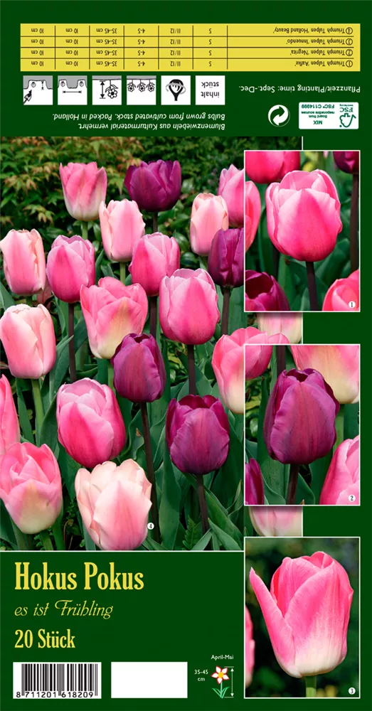 Welch eine Pracht, wenn der Tulpen-Mix 'Hokus Pokus' ab April seine herrlichen, rosafarbenen bis purpurroten Blüten hervorbringt! Das Besondere: sie verbreiten einen angenehmen Duft. Über den dunkelgrünen, linealen Blättern kommen die Blüten besonders gut zur Geltung. Wird Tulipa 'Hokus Pokus' an einen sonnigen Standort mit durchlässigem, lockerem und nährstoffreichem Boden gepflanzt, entwickelt er sich besonders gut. Er wächst schlank und erreicht Größen von 35 cm bis 45 cm bei einer Breite von 15 cm bis 20 cm. Sehr dekorativ macht sich der Tulpen-Mix 'Hokus Pokus' auch in Kübeln oder Kästen.