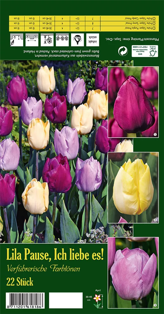 Welch eine Pracht, wenn der Tulpen-Mix 'Lila Pause, Ich liebe es!' ab April seine herrlichen, purpurroten, cremegelben bis lilafarbenen Blüten hervorbringt! Das Besondere: sie verbreiten einen angenehmen Duft. Über den dunkelgrünen, linealen Blättern kommen die Blüten besonders gut zur Geltung. Wird Tulipa 'Lila Pause, Ich liebe es!' an einen sonnigen Standort mit durchlässigem, lockerem und nährstoffreichem Boden gepflanzt, entwickelt er sich besonders gut. Er wächst schlank und erreicht Größen von 30 cm bis 40 cm bei einer Breite von 15 cm bis 20 cm. Sehr dekorativ macht sich der Tulpen-Mix 'Lila Pause, Ich liebe es!' auch in Kübeln oder Kästen.
