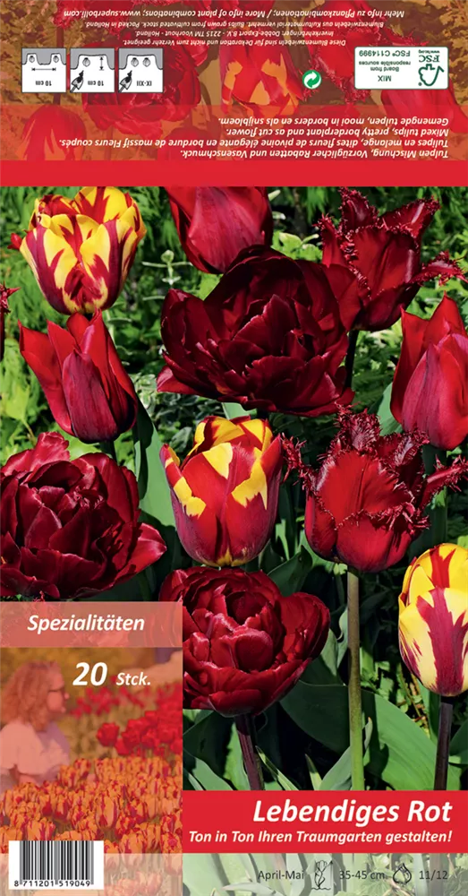 Welch eine Pracht, wenn die Tulpen 'Ton in Ton - Lebendiges Rot' ab April ihre herrlichen, roten Blüten hervorbringt! Das Besondere: sie verbreiten einen angenehmen Duft. Über den dunkelgrünen, linealen Blättern kommen die Blüten besonders gut zur Geltung. Wird Tulipa 'Lebendiges Rot' an einen sonnigen Standort mit durchlässigem, lockerem und nährstoffreichem Boden gepflanzt, entwickelt sie sich besonders gut. Sie wächst schlank und erreicht Größen von 35 cm bis 45 cm bei einer Breite von 15 cm bis 20 cm. Sehr dekorativ macht sich die Tulpen 'Ton in Ton - Lebendiges Rot' auch in Kübeln oder Kästen.
