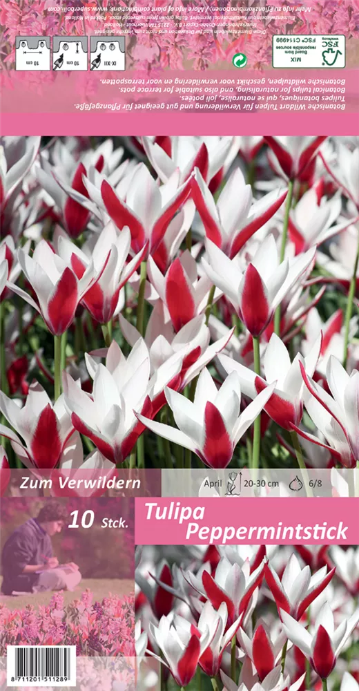 Welch eine Pracht, wenn die Wildtulpe 'Peppermintstick' ab März ihre herrlichen, rot-weißen Blüten hervorbringt! Das Besondere: sie verbreiten einen angenehmen Duft. Über den dunkelgrünen, linealen Blättern kommen die Blüten besonders gut zur Geltung. Wird Tulipa clusiana 'Peppermintstick' an einen sonnigen bis halbschattigen Standort mit durchlässigem, lockerem und nährstoffreichem Boden gepflanzt, entwickelt sie sich besonders gut. Sie wächst schlank und erreicht Größen von 20 cm bis 30 cm. Sehr dekorativ macht sich die Wildtulpe 'Peppermintstick' auch in Kübeln oder Kästen.