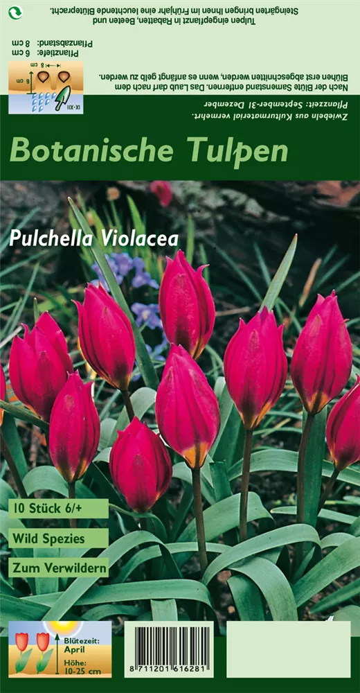 Welch eine Pracht, wenn die Wildtulpe 'Violacea' ab April ihre herrlichen, purpurvioletten Blüten hervorbringt! Das Besondere: sie verbreiten einen angenehmen Duft. Über den dunkelgrünen, linealen Blättern kommen die Blüten besonders gut zur Geltung. Wird Tulipa pulchella 'Violacea' an einen sonnigen Standort mit durchlässigem, lockerem und nährstoffreichem Boden gepflanzt, entwickelt sie sich besonders gut. Sie wächst aufrecht, schlank und erreicht Größen von 10 cm bis 25 cm bei einer Breite von 8 cm bis 12 cm. Sehr dekorativ macht sich die Wildtulpe 'Violacea' auch in Kübeln oder Kästen.