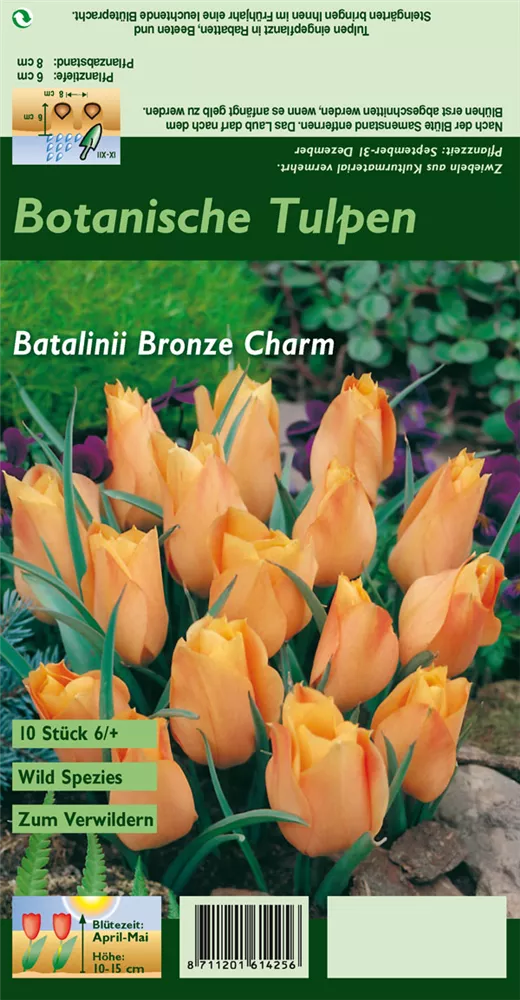 Welch eine Pracht, wenn die Zwerg-Tulpe 'Bronze Charm' ab April ihre herrlichen, lachsorangenen Blüten hervorbringt! Das Besondere: sie verbreiten einen angenehmen Duft. Über den dunkelgrünen, linealen Blättern kommen die Blüten besonders gut zur Geltung. Wird Tulipa batalinii 'Bronze Charm' an einen sonnigen bis halbschattigen Standort mit durchlässigem, lockerem und nährstoffreichem Boden gepflanzt, entwickelt sie sich besonders gut. Sie wächst schlank und erreicht Größen von 10 cm bis 15 cm bei einer Breite von 5 cm bis 10 cm. Sehr dekorativ macht sich die Zwerg-Tulpe 'Bronze Charm' auch in Kübeln oder Kästen.