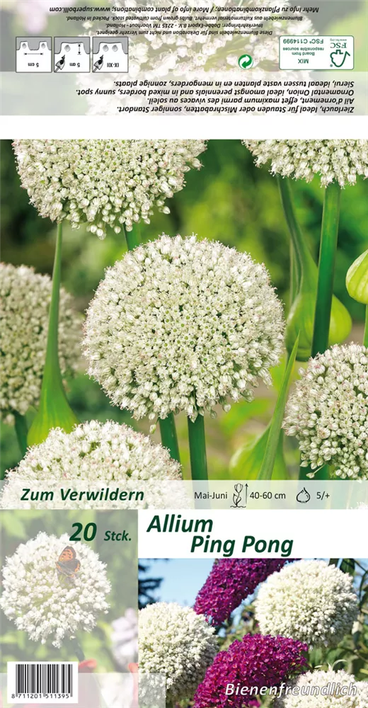 Welch eine Pracht, wenn der Zierlauch 'Ping Pong' ab Mai seine herrlichen, weißen, ballförmigen Blüten hervorbringt! Über den dunkelgrünen, linealen Blättern kommen die Blüten besonders gut zur Geltung. Wird Allium 'Ping Pong' an einen sonnigen Standort mit durchlässigem, humosem und nährstoffreichem Boden gepflanzt, entwickelt er sich besonders gut. Er wächst aufrecht und erreicht Größen von 40 cm bis 60 cm bei einer Breite von 20 cm bis 30 cm.