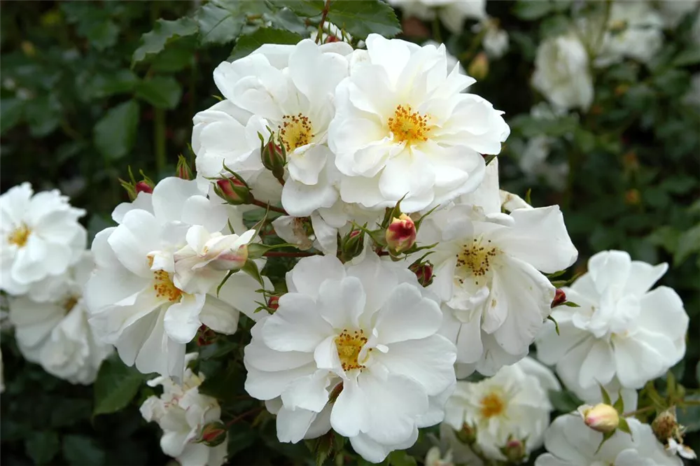 Die weißen, halbgefüllten, schalenförmigen Blüten der Beetrose 'Diamant'® erscheinen in Dolden von Juni bis September. Diese werden etwa 5 - 6 cm groß.