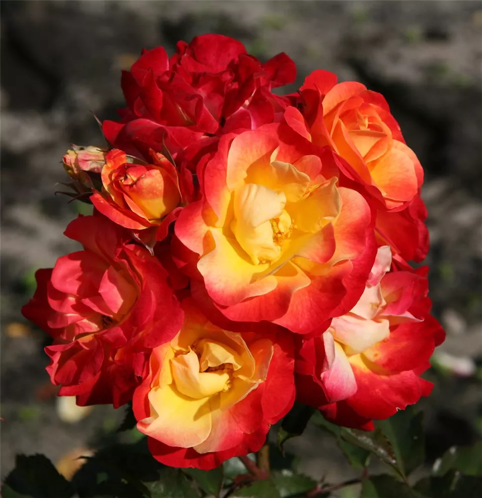 Die gelb-roten, gefüllten, schalenförmigen Blüten der Beetrose 'Firebird'® erscheinen in Dolden von Juni bis September. Diese werden etwa 6 - 7 cm groß.