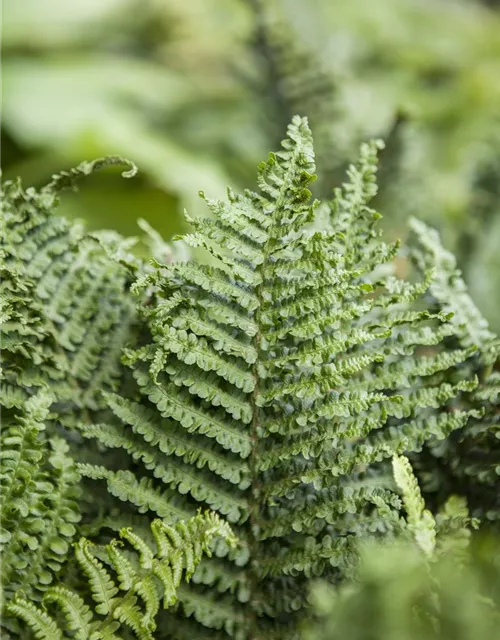 Hoher Blattschmuckwert. Die sommergrünen Blätter des Wald-Frauenfarns sind hellgrün, gefiedert.