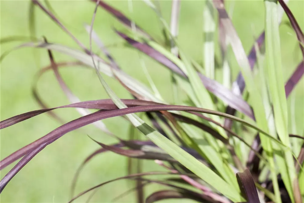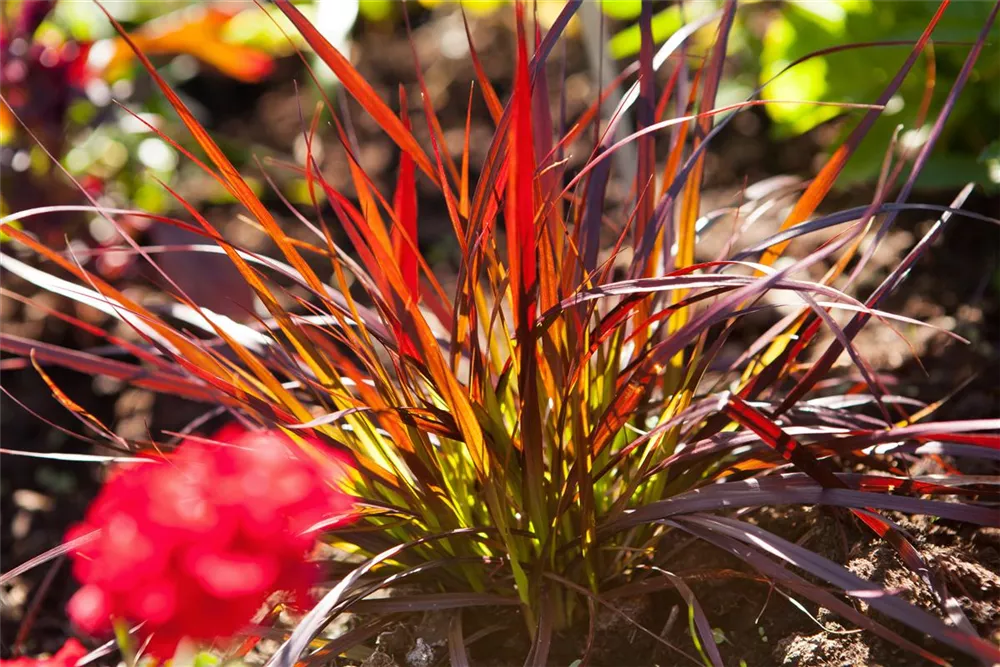 Die sommergrünen Blätter des Federborstengrases 'Rubrum' sind dunkelrot, lanzettlich.