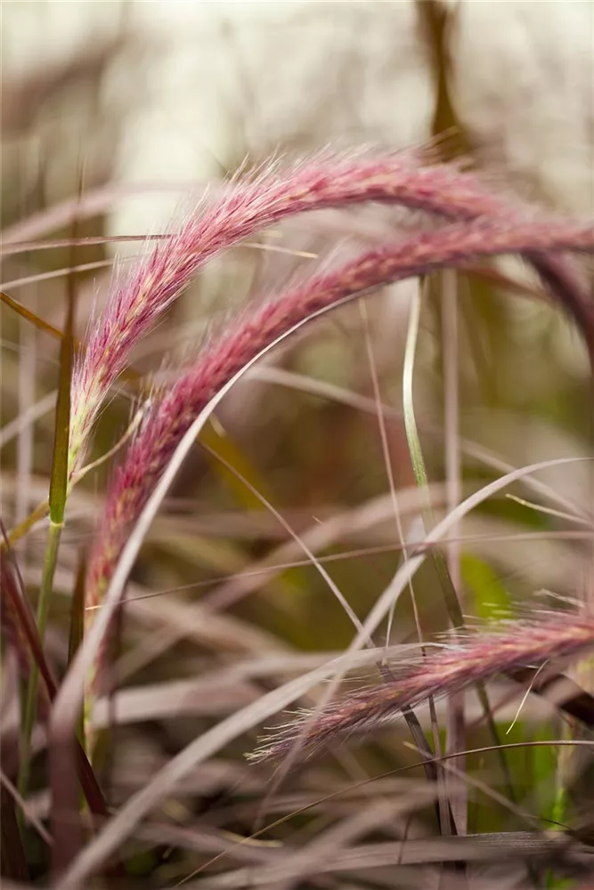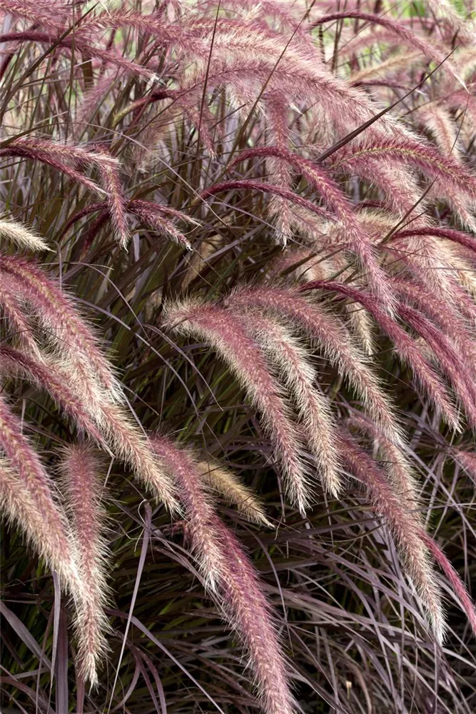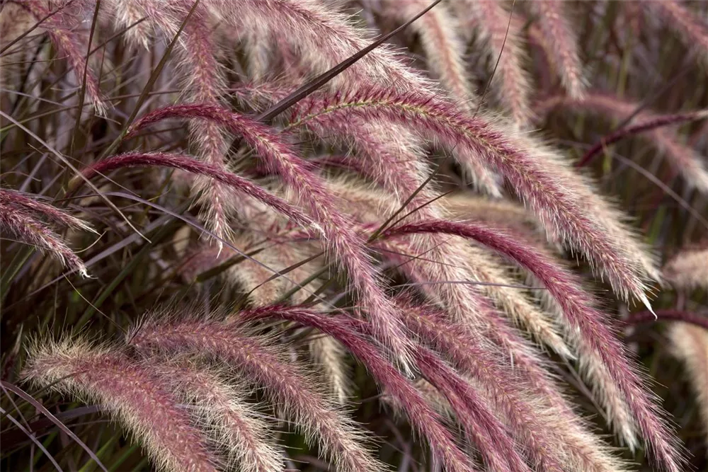Das Federborstengras 'Rubrum' (Pennisetum setaceum) ist mit seiner dunkelroten Blattfärbung ein dekoratives Gestaltungselement im Garten, welches sich an einem sonnigen Standort mit einem möglichst durchlässigen, nährstoffreichen Boden am wohlsten fühlt. Die roten Blütenwedel schmücken die buschig und aufrecht wachsende Pflanze ab Sommer. Bei günstigen Bedingungen erreicht dieses Gras eine Höhe von ca. 50 cm und wird bis zu 50 cm breit.