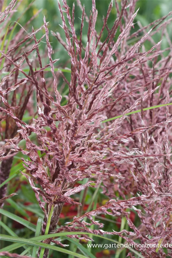 Die rot-braunen, gewellten Blüten des Garten-Chinaschilf 'Dread Locks' erscheinen in Rispen von August bis Oktober.
