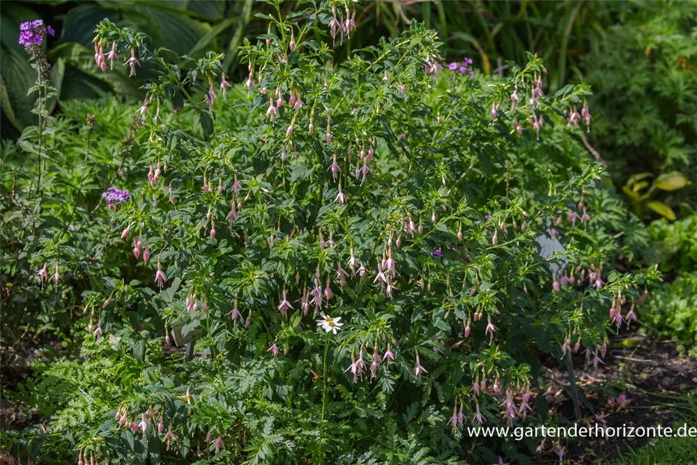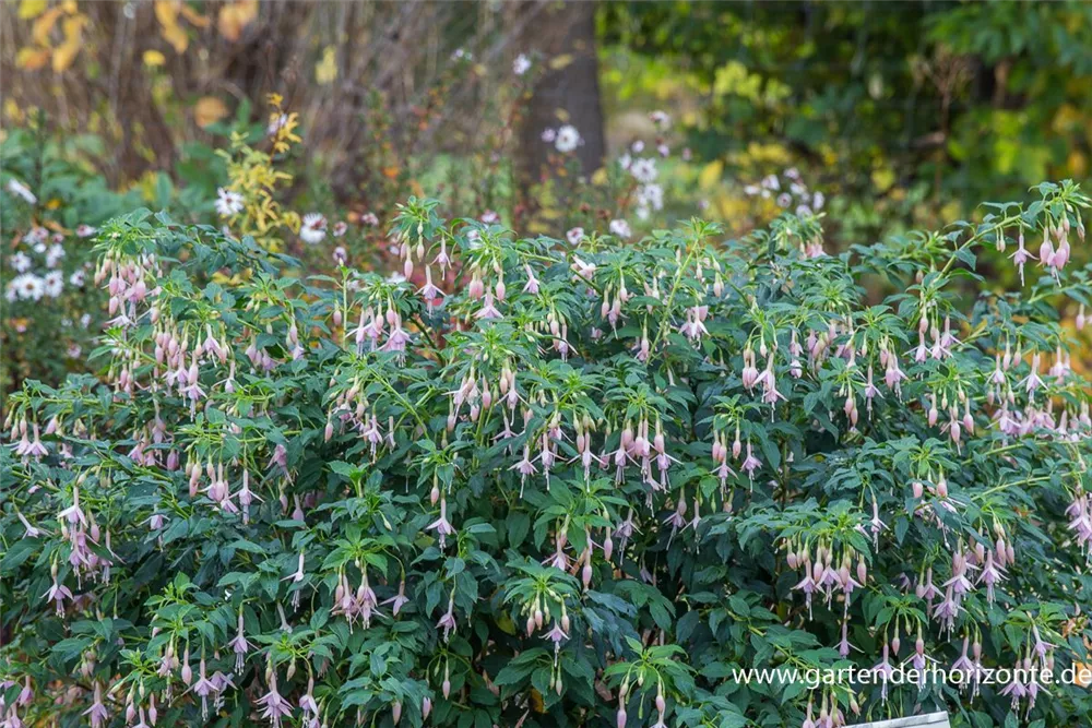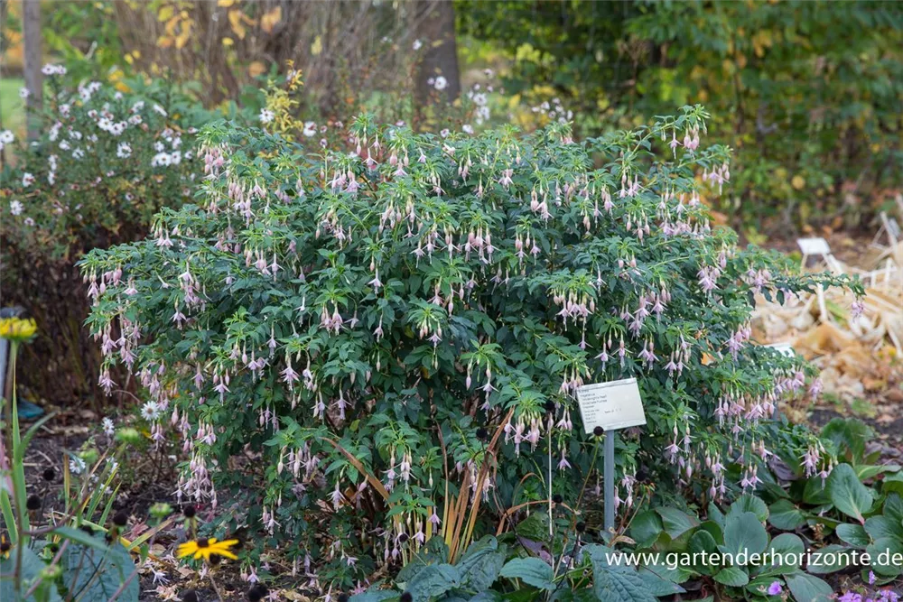 Die Freiland-Fuchsie 'Whiteknight´s Pearl' weist eine gute Frosthärte auf.