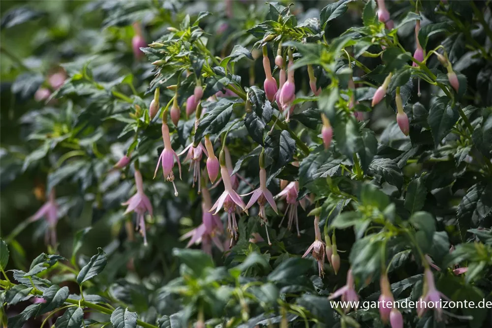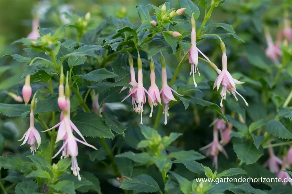 Fuchsia 'Whiteknight´s Pearl' bildet während der gesamten Saison zahlreiche glockenförmige, weiß-rosafarbene Blüten.