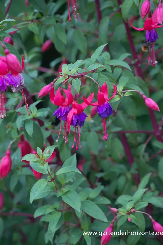 Die Winterharte Fuchsie 'Margaret' (Fuchsia) ist eine aufrechte Staude, die von Juni bis September karminrote, glockenförmige Blüten bildet. An einem sonnigen bis halbschattigen Standort mit durchlässigem, humosem Boden erreicht sie gewöhnlich eine Höhe von ca. 1,2 m und wird ca. 80 cm breit. Die Winterharte Fuchsie 'Margaret' ist gut frostverträglich.