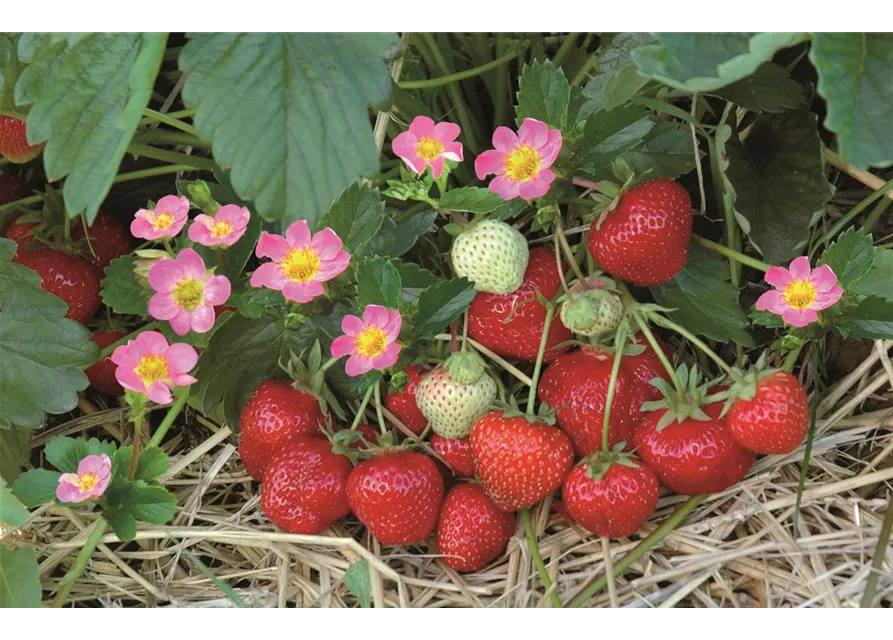 • Immertragend, Naschernte: von Juni bis zum Frostbeginn, Buschiger Wuchs, dunkelgrünes Laub & dekorative, rosa Blüten
