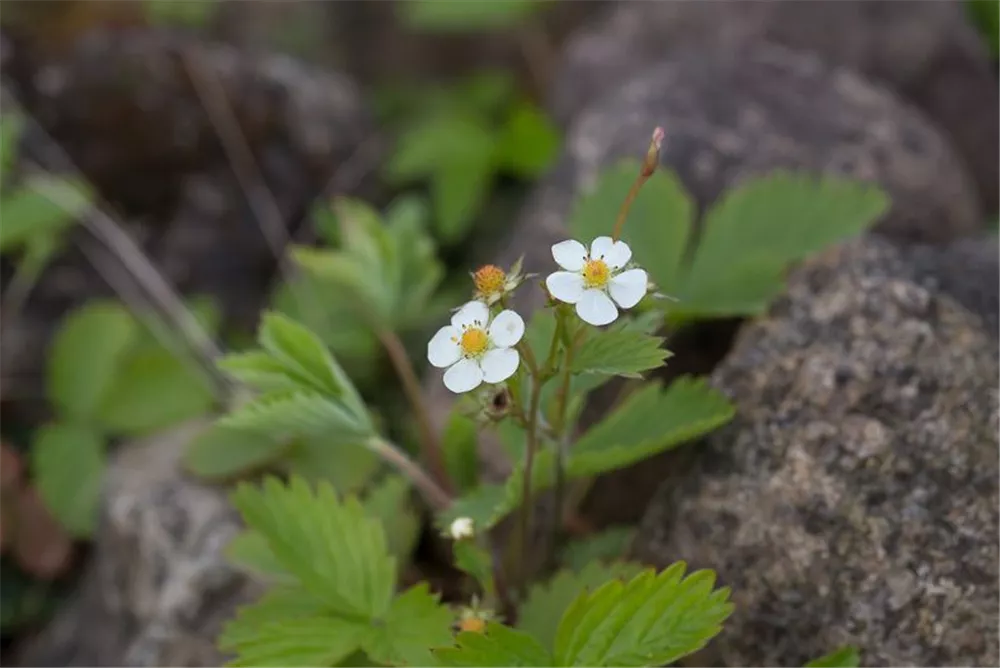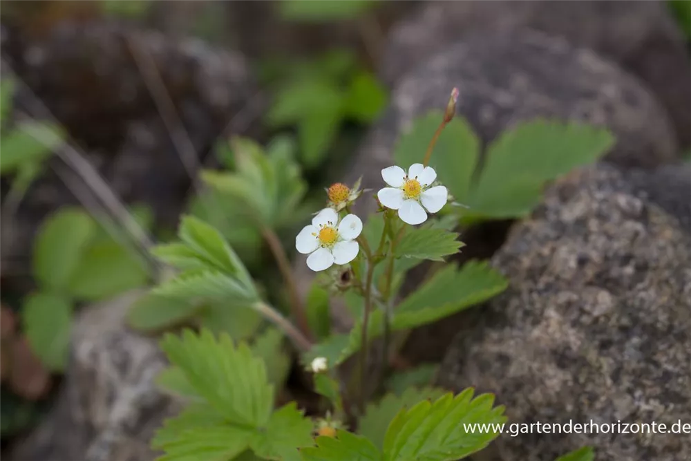 Fragaria vesca var. vesca bildet weiße Blüten ab April.