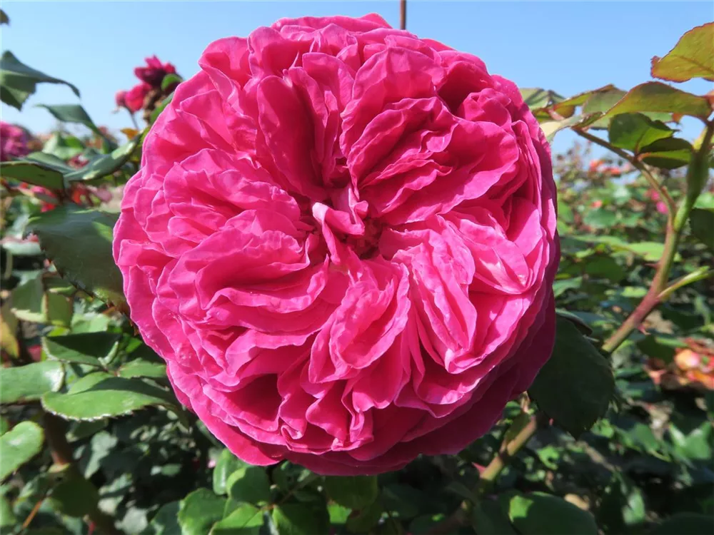 Die magentafarbenen, schalenförmigen Blüten sind starkgefüllt und erscheinen von Juni bis Oktober. Diese sind stark duftend.