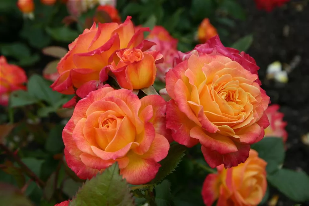 Die gelb-roten, gefüllten, schalenförmigen Blüten der Beetrose 'Gartenspaß'® erscheinen in Dolden von Juni bis September. Diese werden etwa 6 - 7 cm groß.