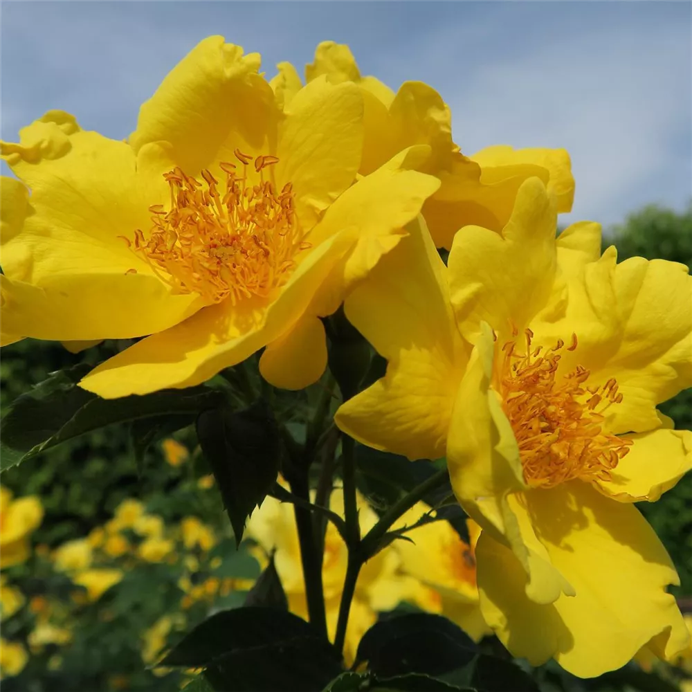 Die gelben, halbgefüllten, schalenförmigen Blüten der Beetrose 'Lemon Fizz'® erscheinen in Dolden von Juni bis September. Diese werden etwa 7 - 8 cm groß.