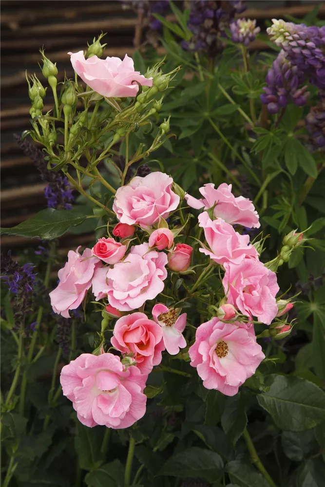 Die Beetrose 'Roselina'® (Rosa) ist eine reichblühende Rose, die im Garten eine besondere Rolle spielt. Die Blüten sind rosa und erscheinen zahlreich von Juni bis September. Mit den richtigen Begleitern an ihrer Seite, kommt die Königin der Blumen besonders gut zur Geltung. Niedrige Stauden, Lavendel und Salbei eignen sich ganz gut für diese Zwecke.